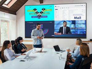 The display comes with a wall mount and can be quickly set up by just two people. It features on-board processing, audio, power from a single 220V cable, native multi-point touch, and multiple inputs to support simultaneous display of up to four content sources. An optional rolling floor stand is available.